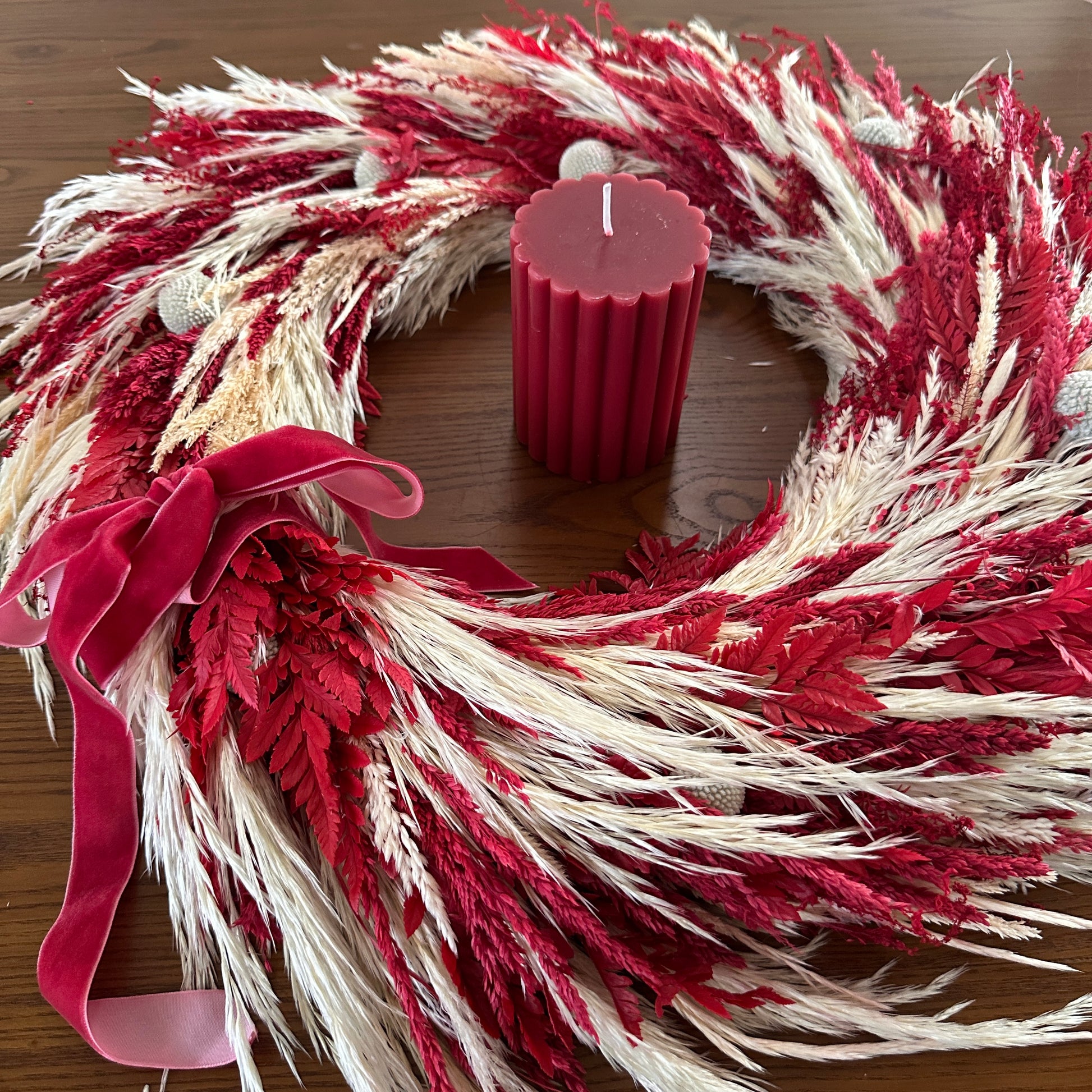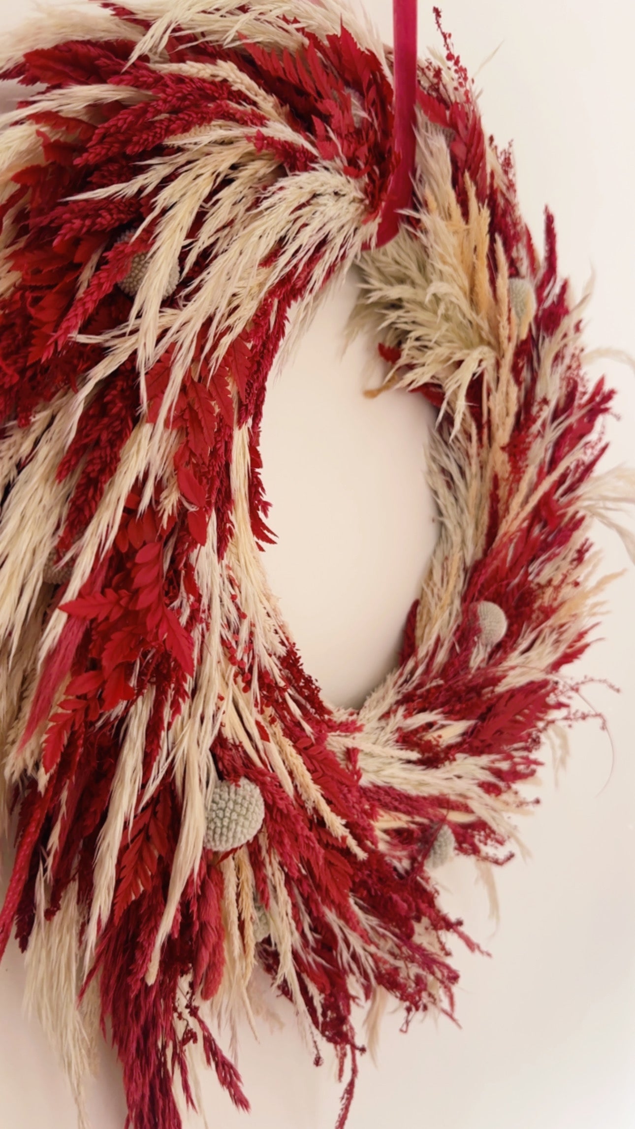 Esta corona está hecha artesanalmente. Tiene una garantía de 3 meses desde la fecha de compra en caso de tener un daño mecánico (que se suelte alguna parte de la misma o se desarme). La garantía no cubre daños por humedad, calor o golpes. El color Rojo de las flores preservadas puede manchar. Las pampas pueden soltar pelusas. Mantener alejada del calor, el sol directo, el agua y ambientes de mucha humedad.