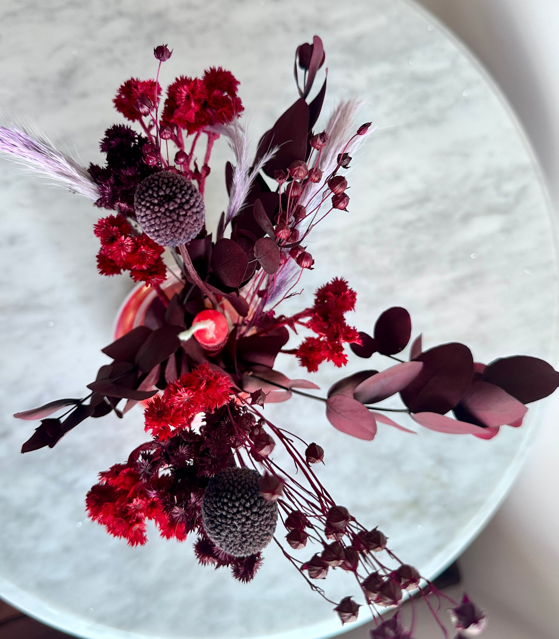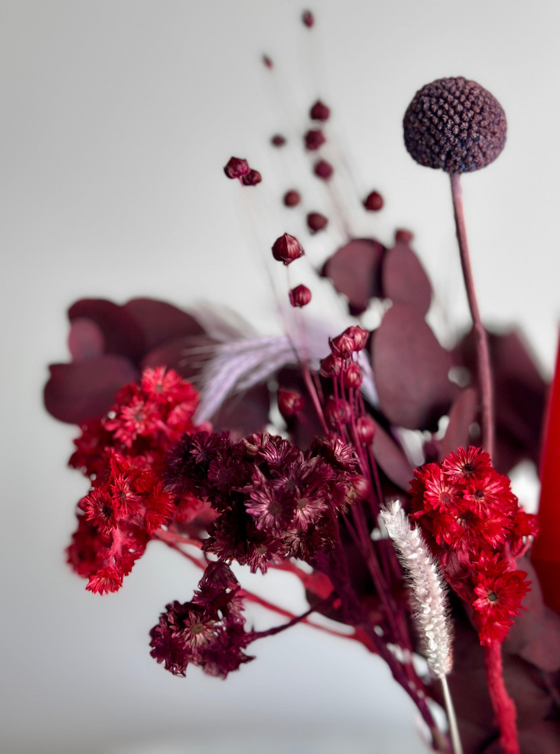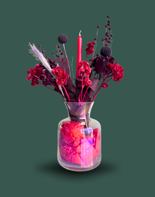 Deck the Halls trae la magia navideña a tu hogar con un arreglo floral en tonos rojos y vino que respira elegancia festiva.